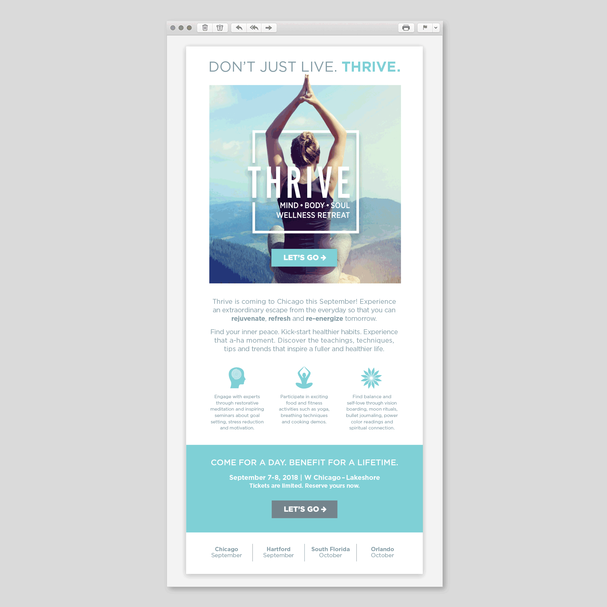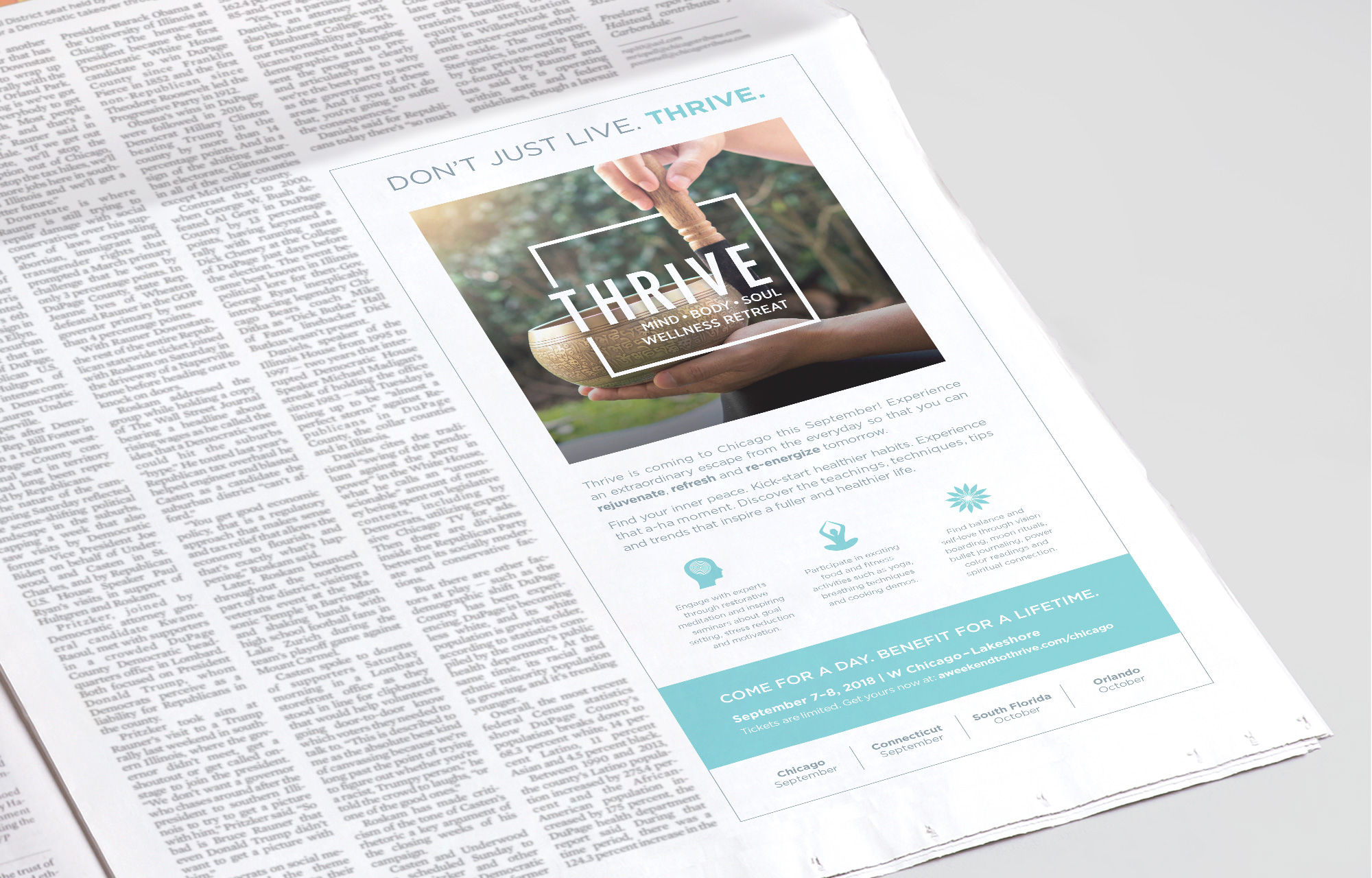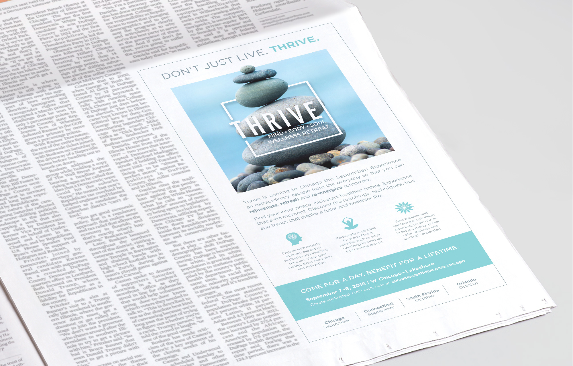 The Tribune Events Group created a new event, Thrive - Mind Body Soul Wellness Retreat, where attendees can improve their well-being by discovering the teachings, techniques, tips and trends that inspire a fuller and healthier life. A brand identity and multi-channel marketing campaign was needed for Thrive. I led art direction, designing the event brand identity and ad campaign in collaboration with designers on my team, as well as providing content, art and layout direction for the website. Inspiration for the logo was taken from the periodic table of elements to reflect the event's focus on enhancement of elements of the mind, body, and soul. A soothing color palette, modern typeface and a trio of calm spa images were selected to reflect the rejuvenating, refreshing and re-energizing aspects of Thrive.